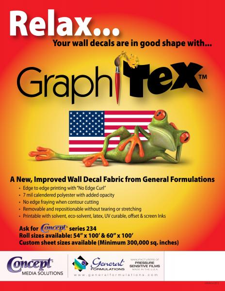 GraphiTex is a 7.0 mil premium white matte coated polyester fabric with an acrylic removable pressure sensitive adhesive backed by a 90# sta flat liner. The combination of fabric and adhesive allows removability of this product from normal wall surfaces. The 90# release liner provides excellent stability for processing using standard solvent, ecosolvent, UV curable and latex digital inks common to wide format digital printing systems.