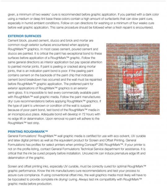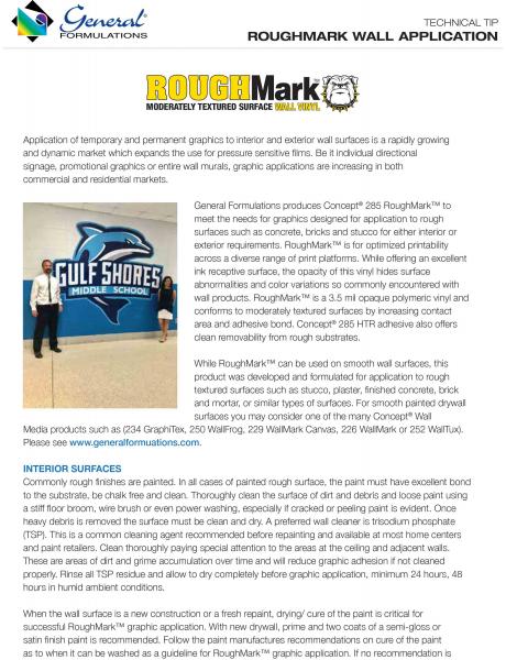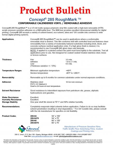 GF 285 RoughMark™ is a 3.5 mil matte opaque polymeric vinyl film coated with a high-tack removable (HTR) acrylic pressure sensitive adhesive on a 90# layflat liner. The 90# liner provides excellent dimensional stability for digital printing. GF 285 accepts a variety of solvent-based, eco-solvent, latex and *UV curable inks common to wide format digital printing systems.