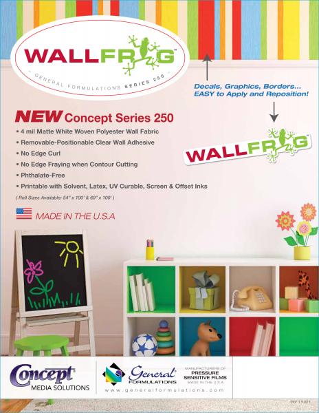 Wall Frog is a 4.0 mil matte white polyester fabric with an acrylic removable pressure sensitive adhesive backed by a 90# stay flat liner. The combination of fabric and adhesive allows removability of this product from normal wall surfaces. The 90# release liner provides excellent stability for processing using standard solvent, eco-solvent, UV curable and latex digital inks common to wide format digital printing systems.
