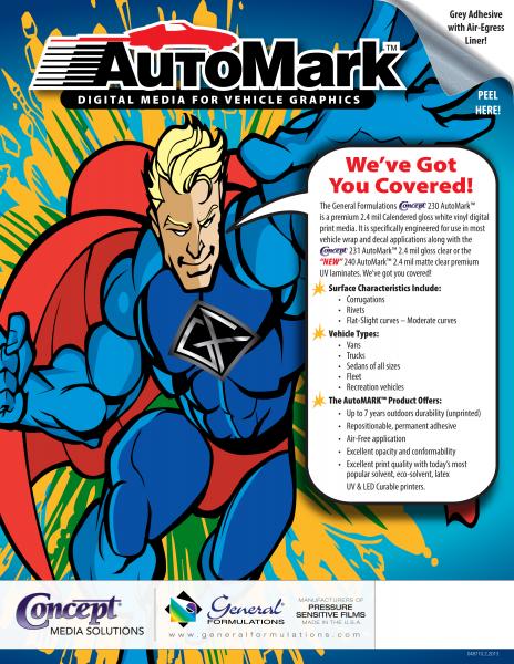 Our AutoMark Bundle is the combination of a Premium 2.4-mil Calendared gloss white vinyl digital media with a grey permanent acrylic adhesive on an air-egress liner, and a 2.4mil Calendered gloss laminate. Both are manufactured by General Formulations.